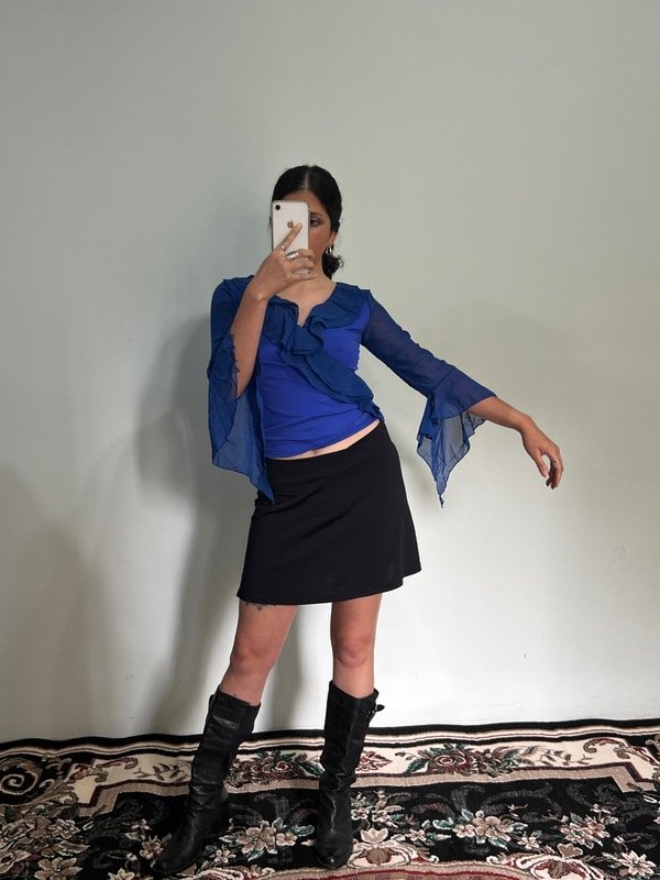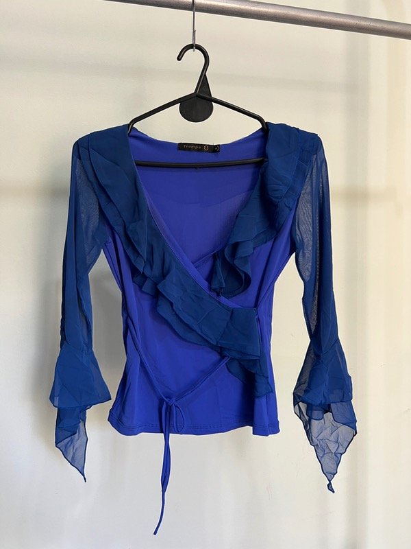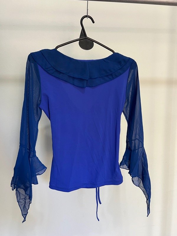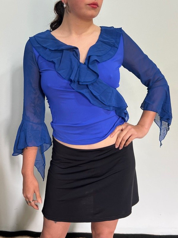 Tela elastizada, tiene mangas con volados y un cordón en la cintura.