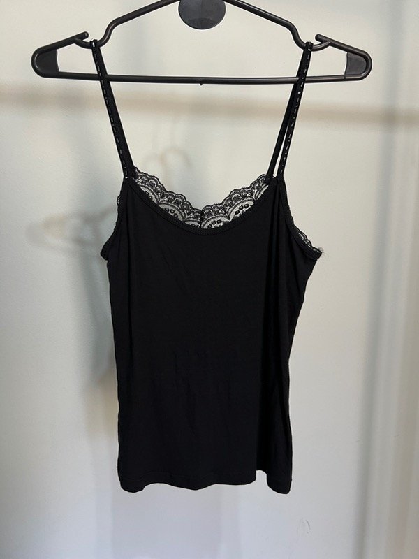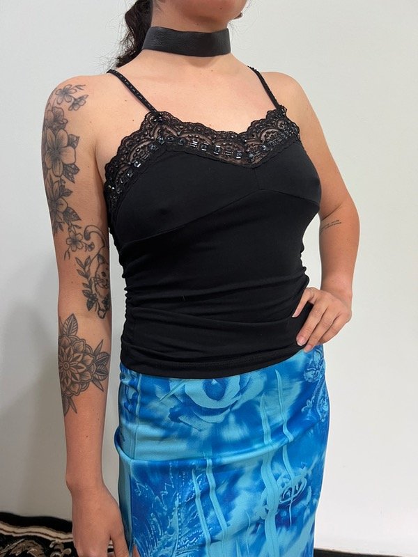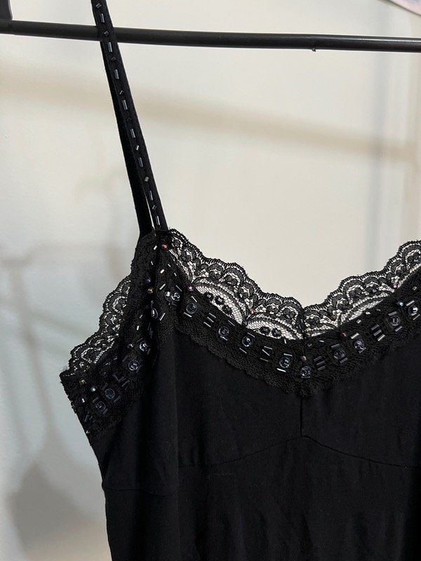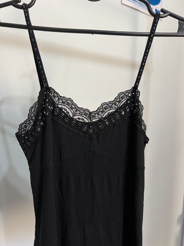 Tiene lentejuelas y canutillos en el frente y las tiras.